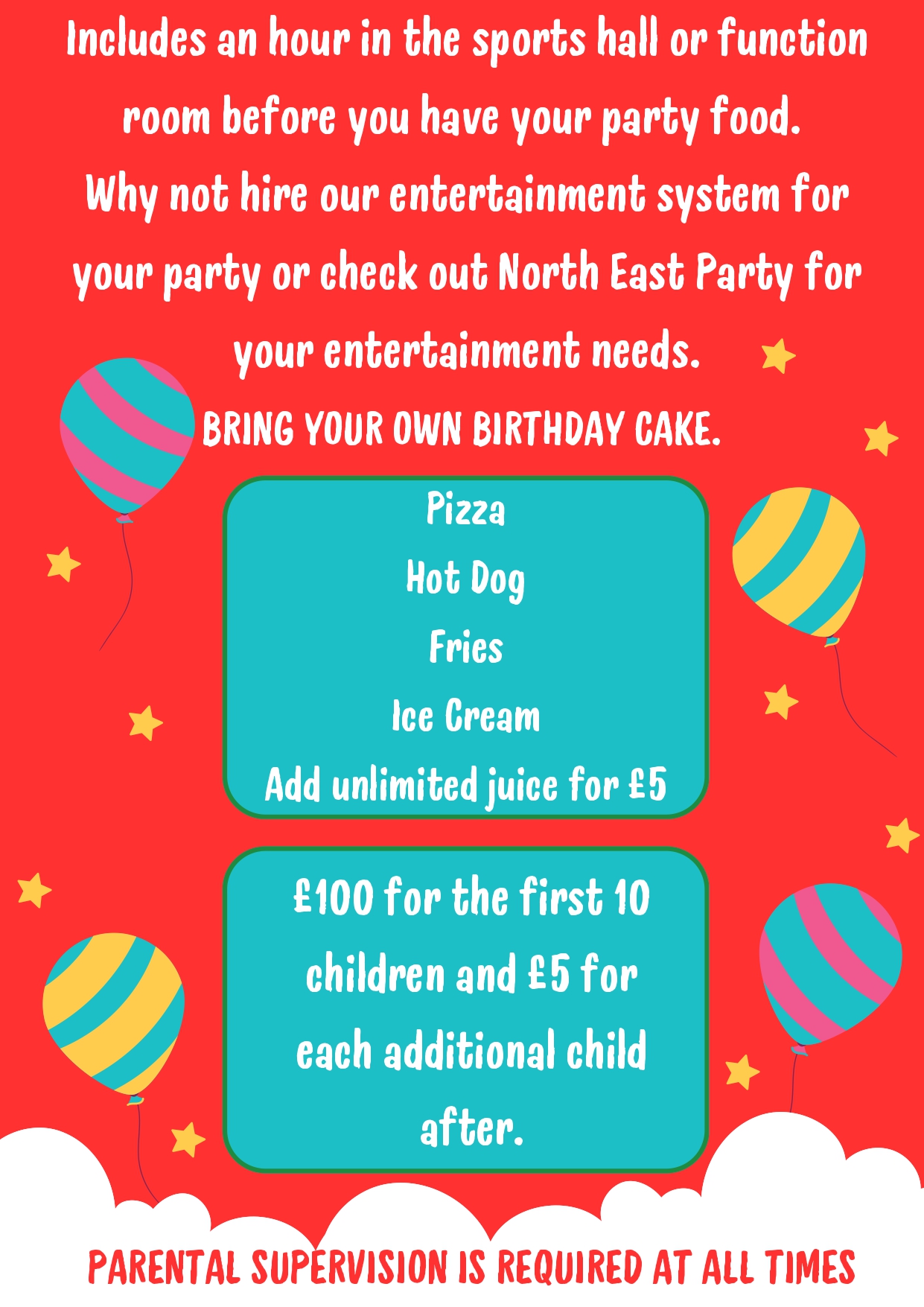 Our Children’s birthday parties involve an hour in the sports hall or function room before you have your party food