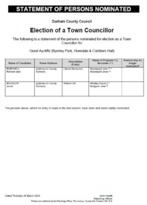 The following is a statement of the persons nominated for election as a Town Councillor for
